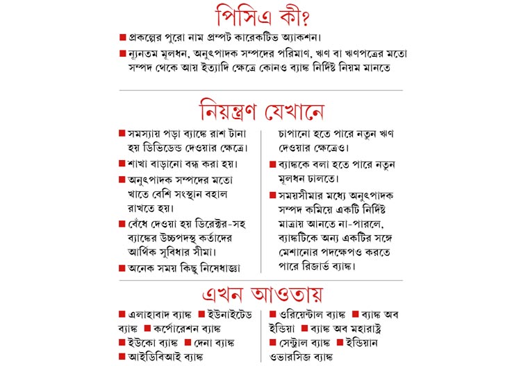 পরে মন্ত্রীর দাবি, ‘‘১১টি ব্যাঙ্কের আর্থিক ভিত পোক্ত করার ব্যবস্থা করে দ্রুত সেগুলির পিসিএ থেকে বেরোনো নিশ্চিত করতে, সব ধরনের সাহায্য করবে সরকার।’’ তবে একই সঙ্গে তাঁর দাবি, এর জন্য কিছুটা সময় লাগবে। কারণ তা শীর্ষ ব্যাঙ্কের স্থির করা নানা মাপকাঠির উপর নির্ভর করে। যেমন, টানা দু’বছর ধরে মুনাফা ইত্যাদি।
