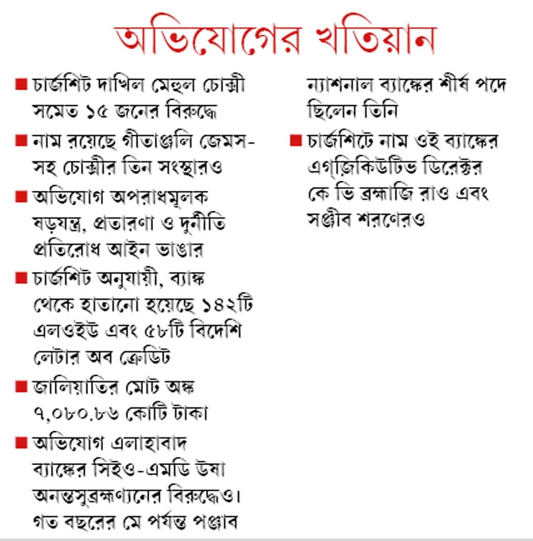 এ দিনের চার্জশিটে নাম রয়েছে মেহুলের গীতাঞ্জলি জেমস, গিলি ইন্ডিয়া, নক্ষত্র ব্র্যান্ডস নামের তিনটি সংস্থা এবং আরও ১৪ জনের।