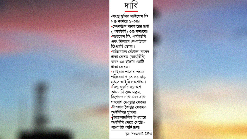 শিল্পের আরও দাবি, টাওয়ার পরিকাঠামোয় যন্ত্রাংশের জন্য মেটানো করের টাকা ফেরতের সুবিধা না-থাকায় অসুবিধায় পড়ছে সংস্থাগুলি। অথচ বাড়ি থেকে কাজের জন্য এবং ৪জি, ৫জি-র জন্য আরও টাওয়ার নির্মাণ জরুরি। যা আর্থিক সমস্যায় ধাক্কা খাচ্ছে। শিল্পের দাবি, ৮৫% যন্ত্রাংশই আমদানি নির্ভর। তার উপরে ন্যূনতম ২০% শুল্ক বসে। যতক্ষণ না দেশেই এই প্রযুক্তির যন্ত্রাংশ তৈরি হচ্ছে, ততদিন শুল্ক কম থাকুক।