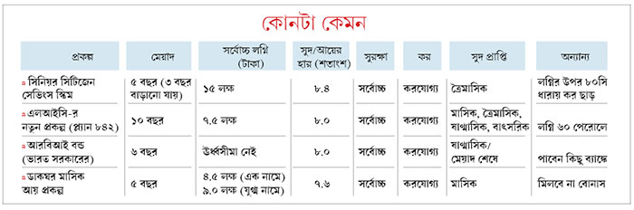 প্রবীণরা লগ্নি করতে পারেন, বর্তমানে এমন কয়েকটি প্রকল্পের তুলনা করে একটি তালিকা দেওয়া হল। এটি তাঁদের সঞ্চয়ের সিদ্ধান্ত নেওয়ায় সাহায্য করতে পারে।