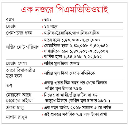 গত বৃহস্পতিবার জীবন বিমা নিগম (এলআইসি)-এর মাধ্যমে বাজারে ছাড়া হয়েছে ৮% আয়ের ১০ বছর মেয়াদি এই বিশেষ প্রকল্প, যার নাম দেওয়া হয়েছে প্রধানমন্ত্রী বয় বন্দনা যোজনা (পিএমভিভিওয়াই) বা প্ল্যান ৮৪২। প্রকল্পটি চালু থাকবে আগামী এক বছর অর্থাৎ ২০১৮ সালের ৩ মে পর্যন্ত। ৬০ বছর বয়স পূর্ণ হলে তবেই লগ্নি করা যাবে এই প্রকল্পে। সর্বাধিক রাখা যাবে ৭.৫ লক্ষ টাকা। এই সীমা পরিবার পিছু (স্বামী, স্ত্রী এবং নির্ভরশীল ব্যক্তি) প্রযোজ্য। সুদ দেওয়া হবে মাসিক, ত্রৈমাসিক, ষাণ্মাসিক অথবা বার্ষিক হিসাবে। বছরে সুদ নিলে আয় দাঁড়ায় ৮.৩%। বর্তমান ব্যাঙ্ক সুদের তুলনায় যা অনেকটাই বেশি। প্রতি মাসে পেনশন নিলে ৭.৫ লক্ষ টাকা লগ্নিতে আপনার ব্যাঙ্কে মাস গেলে আসবে ৫,০০০ টাকা, বছরে ৬০,০০০। এই আয় কিন্তু করযোগ্য। আয় বার্ষিক হিসেবে নিলে ওই ৬০,০০০ টাকার জন্য আপনাকে লগ্নি করতে হবে ৭,২২,৮৯২ টাকা। এলআইসি-র এই প্রকল্পে কত লগ্নিতে কত আয়, তার পুরো পরিসংখ্যান দেওয়া হল সঙ্গের সারণিতে। লগ্নির টাকা বন্ধক রেখে ৩ বছর পূর্ণ হওয়ার পরে ৭৫% পর্যন্ত ঋণ নেওয়া যাবে। মেয়াদ শেষে গ্রাহককে পুরো টাকা ফেরত দিয়ে দেওয়া হবে। তবে তার আগে মৃত্যু হলে টাকা ফেরত দেওয়া হবে গ্রাহকের নমিনিকে।