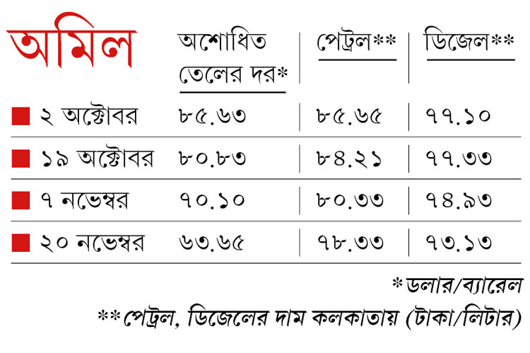 ২ অক্টোবর অশোধিত তেল ব্রেন্ট ক্রুডের দাম ব্যারেলে ছিল ৮৫.৬৩ ডলার। ২০ নভেম্বর তা নেমেছে ৬৩.৬৫ ডলারে। কমেছে প্রায় ২২ ডলার। অথচ সেই সময়ে পেট্রল ও ডিজেলের দর লিটারে কমেছে যথাক্রমে প্রায় ৭ ও ৪ টাকা করে।