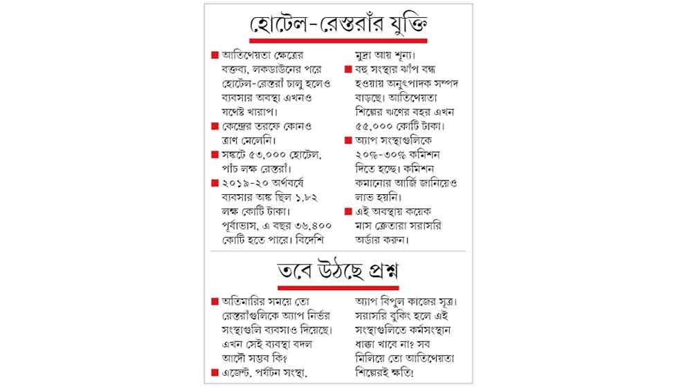 লকডাউনের সময়ে সম্পূর্ণ বন্ধ থাকার পরে আতিথেয়তা শিল্প (হোটেল ও রেস্তরাঁ) ধীরে ধীরে চালু হলেও ব্যবসার অবস্থা এখনও যথেষ্ট নড়বড়ে। তাদের অভিযোগ, বারবার আর্জি জানিয়েও কেন্দ্রের কাছ থেকে কোনও রকম ত্রাণ মেলেনি। এই অবস্থায় রেস্তরাঁর খাবার কিনতে বা হোটেলের ঘর ভাড়া করতে সরাসরি যোগাযোগ করার জন্য ক্রেতা ও পর্যটকদের কাছে আর্জি জানাল এই ক্ষেত্রের সংগঠন ফেডারেশন অব হোটেল অ্যান্ড রেস্তরাঁ অ্যাসোসিয়েশন্স অব ইন্ডিয়া (এফএইচআরএআই)। তবে প্রশ্ন উঠেছে, ক্রেতাদের বরাত পৌঁছে দেওয়ার যে পরিকাঠামো অ্যাপ নির্ভর সংস্থাগুলির রয়েছে, তা হোটেল-রেস্তরাঁরা আছে কি? তা ছাড়া পর্যটন এজেন্ট বা অ্যাপ নির্ভর খাবার সরবরাহ সংস্থার মাধ্যমে বুকিং কমে গেলে ঘুরিয়ে সেই আতিথেয়তা শিল্পেরই ক্ষতি হবে না?