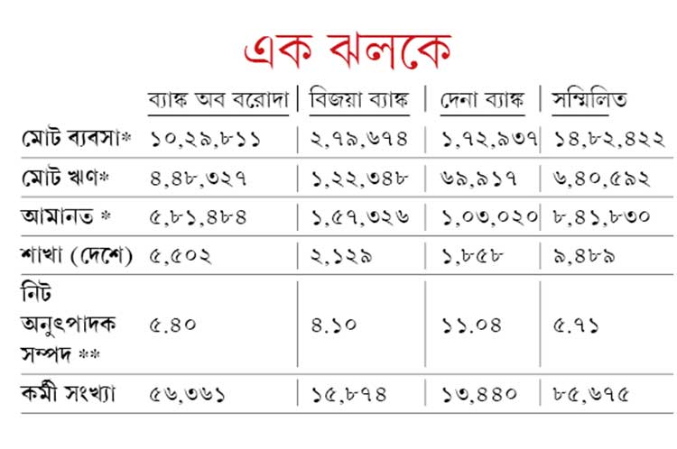 ব্যাঙ্ক তিনটির মধ্যে দেনা ব্যাঙ্ক দুর্বল। গত ১১টি ত্রৈমাসিকে তাদের মোট লোকসান দাঁড়িয়েছে ৪,৫০০ কোটি টাকা। ঘাড়ে বিপুল অনুৎপাদক সম্পদের বোঝা। ব্যাঙ্কটি এখন রয়েছে প্রম্পট কারেকটিভ অ্যাকশনের আওতায়। জেটলি বলেছেন, প্রস্তাব কার্যকর হলে দেনা ব্যাঙ্ককে চাঙ্গা করার দায়িত্ব নেবে তুলনামূলক ভাবে মজবুত ব্যাঙ্ক অব বরোদা এবং বিজয়া ব্যাঙ্ক। পাশাপাশি, নতুন ব্যাঙ্কটি দেশের তৃতীয় বৃহত্তম ব্যাঙ্কে পরিণত হবে। তবে কোনও ব্যাঙ্কেরই কর্মী ছাঁটাই হবে না বলে জেটলির দাবি।