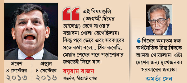 প্রথমটার জবাব পেতে হলে তাকিয়ে থাকতে হবে ২৩ জুনের গণভোটের দিকে। দ্বিতীয়টায় যবনিকা পড়ে গেল আজ। রিজার্ভ ব্যাঙ্কের কর্মীদের খোলা চিঠি দিয়ে রাজন জানিয়ে দিলেন, দ্বিতীয় দফায় গভর্নর পদের দায়িত্ব আর নিতে চান না তিনি। আগামী ৪ সেপ্টেম্বর মেয়াদ শেষ হওয়ার পর ফিরে যাবেন শিক্ষকতা ও গবেষণার জগতে। চিঠিতে রাজন জানিয়েছেন, সরকারের সঙ্গে আলোচনা করেই তাঁর এই সিদ্ধান্ত।