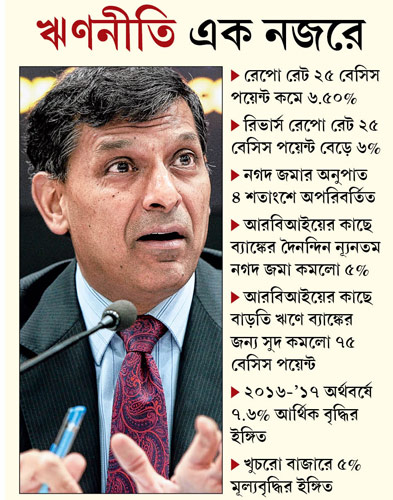 তহবিল সংগ্রহের খরচ কমাতে রেপো রেট কমিয়েছেন রাজন। পাশাপাশি ২৫ বেসিস পয়েন্ট বাড়িয়ে ৬% করেছেন রিভার্স রেপো রেট (বাণিজ্যিক ব্যাঙ্কগুলি রিজার্ভ ব্যাঙ্ককে ঋণ দিয়ে যে-সুদ পায়)। ফলে এখন থেকে রিজার্ভ ব্যাঙ্ককে ঋণ দিয়ে রিভার্স রেপো খাতে সুদ বাবদ বেশি আয় করার সুযোগ পাবে ব্যাঙ্কগুলি। তহবিল সংগ্রহের খরচ কমাতে মার্জিনাল স্ট্যান্ডিং ফেসিলিটির (এমএসএফ) আওতায় সুদের হারও কমানো হয়েছে। রেপো খাতে ঋণ নেওয়ার ঊর্ধ্বসীমা অতিক্রম করার পরেও যদি ব্যাঙ্কগুলিকে রিজার্ভ ব্যাঙ্কের থেকে ঋণ নিতে হয়, তা হলে এমএসএফ খাতে তা মেলে। ওই বাড়তি ঋণে সুদও ৭.৭৫% থেকে কমিয়ে করা হয়েছে ৭%।