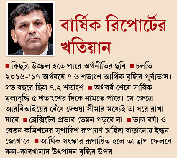খুচরো বাজারের মূল্যবৃদ্ধিকে মাথা তুলতে না-দেওয়ার লক্ষ্যেই অটল ভারতীয় রিজার্ভ ব্যাঙ্ক। শীর্ষ ব্যাঙ্কের গভর্নর হিসেবে শেষ বারের মতো লেখা বার্ষিক রিপোর্টের মুখবন্ধে আর একবার সে কথাই মনে করিয়ে দিয়েছেন রঘুরাম রাজন। সে ক্ষেত্রে সরকারের স্থির করা খুচরো মূল্যবৃদ্ধির লক্ষ্যমাত্রা ৪ শতাংশকেই পাখির চোখ করবে রিজার্ভ ব্যাঙ্ক। সোমবার প্রকাশিত এই রিপোর্টে চলতি ২০১৬-’১৭ অর্থবর্ষের জন্য ৭.৬ শতাংশ আর্থিক বৃদ্ধির পূর্বাভাস দেওয়া হয়েছে। আগের বছর তা ছিল ৭.২ শতাংশ। তবে মূল্যবৃদ্ধির চাপ আর্থিক বৃদ্ধিকে টেনে নামাতে পারে বলে রিপোর্টে উল্লেখ করেছে আরবিআই।