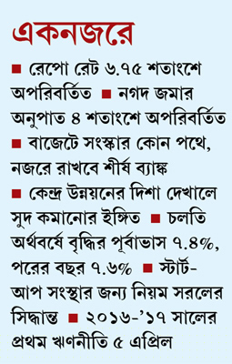 আগামী বাজেটে কেন্দ্র আর্থিক বৃদ্ধির পথে দেশকে এগিয়ে নিয়ে যেতে প্রয়োজনীয় পদক্ষেপ করলে রিজার্ভ ব্যাঙ্কেরও উন্নয়নের খাতিরে কম সুদে ঋণ পাওয়ার ব্যবস্থা করতে দ্বিধা থাকবে না— এই মন্তব্য করে আপাতত সুদের হার অপরিবর্তিত রাখলেন শীর্ষ ব্যাঙ্কের গভর্নর রঘুরাম রাজন।