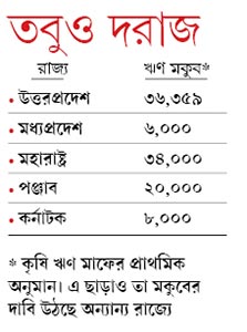 অথচ এই উত্তরপ্রদেশেই গত বিধানসভা নির্বাচনে ভোট-বৈতরণী পার হতে কৃষি-ঋণ মকুবের প্রতিশ্রুতি দিয়েছিল বিজেপি। মসনদ দখলের পরে সেই কথা রেখে ছোট-মাঝারি চাষিদের প্রত্যেকের ১ লক্ষ টাকা পর্যন্ত ধার মাফের কথা ঘোষণা করেছেন মুখ্যমন্ত্রী যোগী আদিত্যনাথ। যার ফলে অন্তত ৩৬ হাজার কোটি টাকার বোঝা চাপতে চলেছে তাঁর রাজ্যের ঘাড়ে। একই ছবি মহারাষ্ট্র সমেত অন্য অনেক রাজ্যেও। আরব সাগরের তীরের ওই রাজ্যে ৩৪ হাজার কোটির বোঝা ঘাড়ে নিয়ে কৃষি-ঋণ মাফের কথা বলেছেন মুখ্যমন্ত্রী দেবেন্দ্র ফডণবীস। অথচ ২০১৫-’১৬ সালেই তাদের রাজকোষ ঘাটতির অঙ্ক ৩৭,৯৫০ কোটি টাকা।