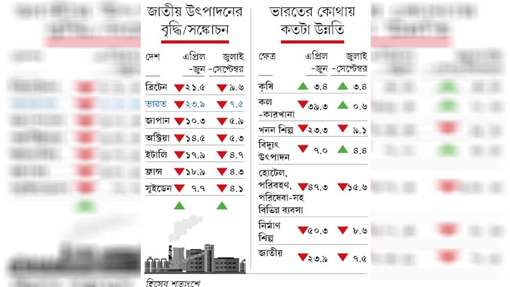 জিডিপি ছাড়া শুক্রবার প্রকাশিত হয়েছে অক্টোবরে পরিকাঠামো শিল্পে উৎপাদনের হিসেব। যা সঙ্কুচিত হয়েছে ২.৫%। উৎপাদন কমেছে অশোধিত তেল ও প্রাকৃতিক গ্যাসের, যথাক্রমে ৬.২% এবং ৮.৬%। তবে কিছুটা স্বস্তি দিয়েছে কয়লা ও বিদ্যুৎ। উৎপাদন বৃদ্ধির হার দুই অঙ্ক ছাড়িয়েছে। একই দিনে প্রকাশিত হয়েছে রাজকোষ ঘাটতির খবরও। জানা গিয়েছে, অক্টোবরে তা পৌঁছেছে ৯.৫৩ লক্ষ কোটি টাকায়, যা পুরো বছরের লক্ষ্যমাত্রার ১১৯.৭%। অথচ বছর শেষ হতে পাঁচ মাস বাকি। করোনার কারণে যেমন কেন্দ্রের আয় কমেছে, তেমনই খরচ বেড়েছে অনেকটাই।