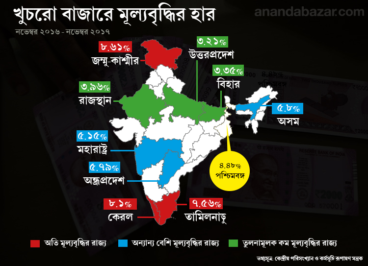 খুচরো মূল্যবৃদ্ধির হারে দেশের মধ্যে সবচেয়ে আগে রয়েছে জম্মু-কাশ্মীরের নাম। মূল্যবৃদ্ধির হার ৮.৬১ শতাংশ। দ্বিতীয় স্থানে রয়েছে কেরল, মূল্যবৃদ্ধির হার ৮.১ শতাংশ। তামিলনাড়ুতেও খুচরো মূল্যবৃদ্ধির হার চোখে পড়ার মতো, ৭.৫৬ শতাংশ।