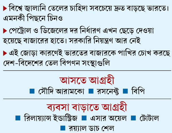 জ্বালানি তেলের বাজারের মাপে ভারত চতুর্থ। ইন্টারন্যাশনাল এনার্জি এজেন্সির সাম্প্রতিক রিপোর্ট দেখাচ্ছে, ২০১৬ সালের প্রথম ত্রৈমাসিকে এখানে পেট্রোল-ডিজেলের চাহিদা বেড়েছে দুনিয়ায় সব থেকে দ্রুত। তাই স্বাভাবিক ভাবেই এখন খুচরো তেল বিক্রির এই লোভনীয় বাজারে পা রাখতে চাইছে প্রথম সারির তেল বহুজাতিকগুলি। যাদের মধ্যে রয়েছে সৌদি আরবের সৌদি আরামকো-ও। সেই আরামকো, যারা ব্যবসার বহরে পৃথিবীর বৃহত্তম সংস্থা। ব্যবসার অঙ্ক ৩৭,৮০০ কোটি ডলার। বাজারে প্রথম বার মাত্র ৫% শেয়ার ছেড়েই ১০ হাজার কোটি ডলারের তহবিল তৈরির পরিকল্পনা করছে তারা।