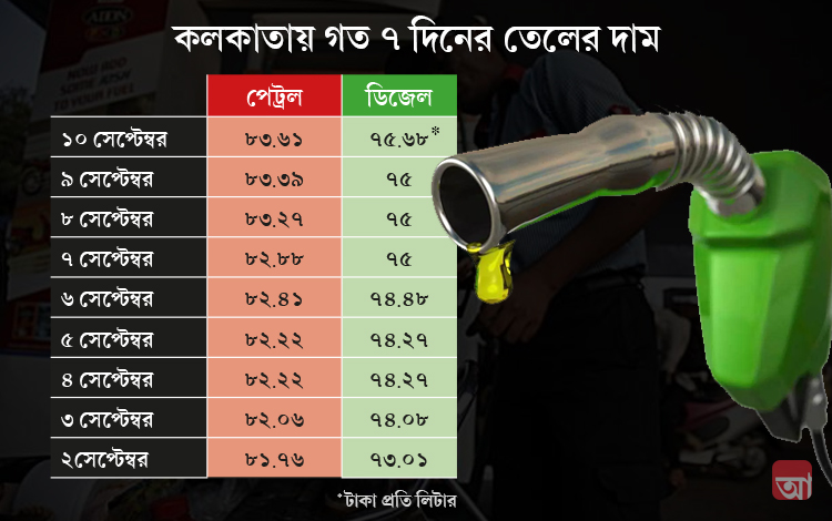টাকার সঙ্গে পাল্লা দিচ্ছে পেট্রো-পণ্যগুলোও। বিশ্ববাজারে অপরিশোধিত তেলের দাম বৃদ্ধির প্রভাব এবং টাকার দামে পতন ঘটায় এ দেশে পেট্রল-ডিজেলের দামও ঊর্ধ্বমুখী। মুম্বইতে গত কালের তুলনায় ২৩ পয়সা বেড়ে গিয়ে পেট্রল এবং ডিজেলের দাম দাঁড়ায় যথাক্রমে লিটার প্রতি ৮৮.১২ এবং ৭৭.৩২ টাকা। রাজধানী দিল্লিতে পেট্রল ও ডিজেলের দাম লিটার প্রতি যথাক্রমে ৮০.৭৩ এবং ৭৬.৯৮ টাকা। কলকাতায় সোমবার লিটার প্রতি পেট্রলের দাম ৮৩.৬১ টাকা। এবং ডিজেলের ছুঁয়েছে লিটার প্রতি ৭৫.৬৮ টাকা। তিন শহরের দামই সর্বকালীন রেকর্ড।