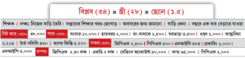 তবে এ বার বিপ্লবকে ভাবতে হবে নিজের স্ত্রী-সন্তানের জন্যও। যেটা তিনি শুরুও করেছেন। তাঁর সঞ্চয়ের কিছু কিছু সিদ্ধান্ত বেশ ভাল। ভবিষ্যৎকে আরও মসৃণ করতে তাতেই কয়েকটা মোচড় দরকার শুধু। এখন আমার কাজ সেই কৌশলটাই দেখিয়ে দেওয়া।