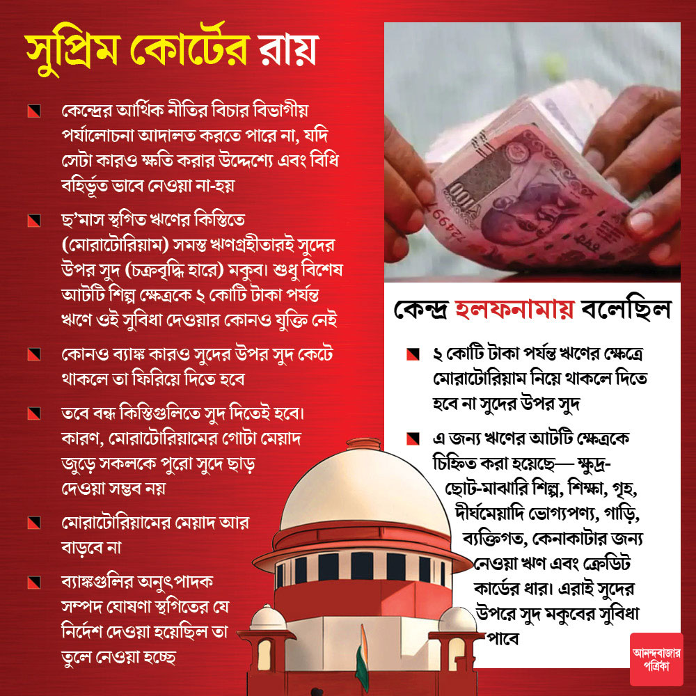 শুরুতে কেন্দ্র জানিয়েছিল, যে কোনও ধরনের সুদ মকুব করা হলেই আর্থিক শৃঙ্খলা নষ্ট হবে। কারণ, আমানতে সুদ দেওয়া বন্ধ হয়নি। কিন্তু অক্টোবরের শুনানিতে সুপ্রিম কোর্ট জানায়, অতিমারির সময়ে দেওয়া মোরাটোরিয়ামে গ্রাহকদের সুদের উপরে সুদ গুনতে হলে সুবিধা দেওয়ার আসল উদ্দেশ্যই ব্যর্থ হবে। শীর্ষ আদালতের কড়া অবস্থানের পরেই সরকার জানায়, আটটি ক্ষেত্রের ২ কোটি পর্যন্ত মেয়াদি ঋণে সুদের উপরে সুদ দিতে হবে না গ্রাহকদের। সেই টাকা তাঁদের ঋণের অ্যাকাউন্টে দিয়ে দেবে ব্যাঙ্ক। আর ব্যাঙ্কগুলিকে তা মিটিয়ে দেবে কেন্দ্র। এই খাতে সরকারের খরচ হবে ৬৫০০ কোটি টাকা।