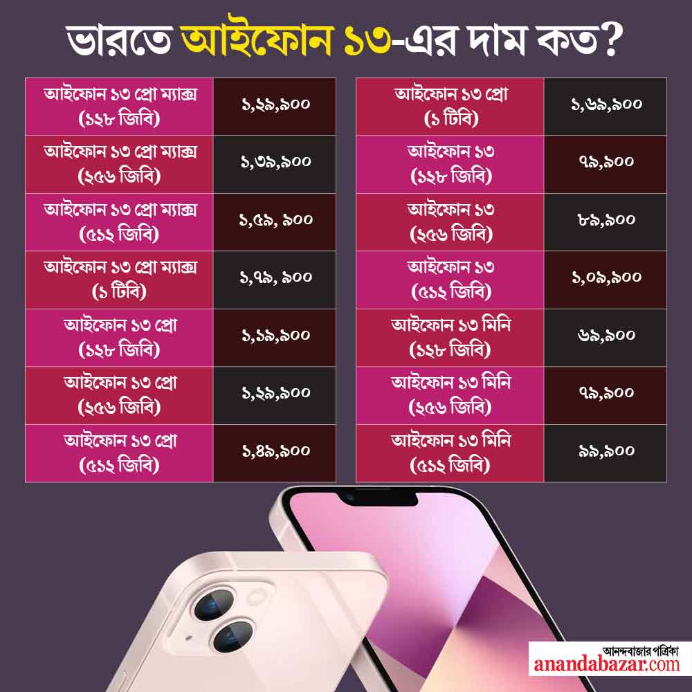 অ্যাপলের আইফোন-১৩ নিয়ে বিশ্ব জুড়ে তৈরি হয়েছে আগ্রহ। বাজারে আইফোন-১৩ মোট ১৪টি মডেলে এসেছে। ভারতের বাজারে এই ফোনের দাম কত হতে পারে, তা নিয়ে জল্পনা চলছিল। এ বিষয়ে সবিস্তার তথ্য এসে গিয়েছে। সবচেয়ে বেশি দাম হবে আইফোন-১৩ প্রো ম্যাক্স (১ টিবি) মডেলটির। ভারতে এই মডেলের দাম হবে ১ লাখ ৭৯ হাজার ৯০০ টাকা। এই সিরিজের ফোনগুলির মধ্যে সবচেয়ে কম দাম আইফোন-১৩ মিনির। এর দাম ৬৯ হাজার ৯০০ টাকা।