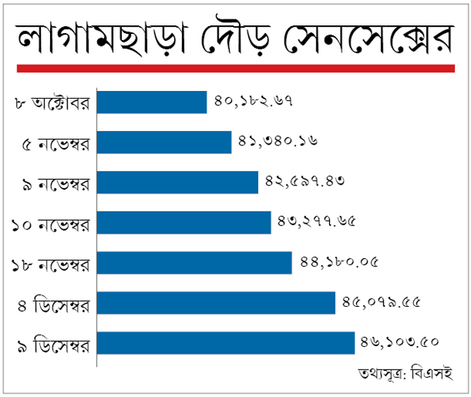 অতিমারি, অর্থনীতির মন্দা— কোনও কিছুকে তোয়াক্কা না-করে সূচক ছুটছে আপন মনে। মার্চে যে সেনসেক্স নেমেছিল ২৬ হাজারের নীচে, তা-ই অক্টোবর থেকে দু’মাসে ৪০ হাজার থেকে লাফ দিয়েছে ৪৬ হাজারের ঘরে। মোট উত্থান ৫৯২০.৮৩ পয়েন্ট। বুধবার এই প্রথম ৪৬,১০৩.৫০ অঙ্কে থেমে সেনসেক্স নতুন রেকর্ড গড়েছে। বেড়েছে ৪৯৫ পয়েন্ট। নিফ্টিও ১৩৬ পয়েন্ট বেড়ে নজিরবিহীন ১৩,৫২৯।