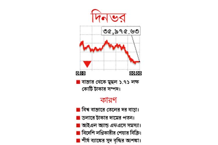 বিশেষজ্ঞেরা বলছেন, টাকা ও তেলের দাম, আর্থিক সংস্থার স্বাস্থ্য-সহ নানা বিষয় ঘিরে অনিশ্চয়তা বাড়ছে। সে সবের জেরে অর্থনীতি কতটা ভুগবে, তা নিয়ে উদ্বিগ্ন লগ্নিকারীরা। শেয়ার ধরে রাখলে লাভের মুখ দেখা যাবে কি না, আস্থার এই খুঁটিটাই খুঁজে পাচ্ছেন না অনেকে। ফলে নামছে বাজার। যে কারণে বুধবার সেনসেক্স পড়েছে ৫৫০.৫১ পয়েন্ট। দাঁড়িয়েছে ৩৫,৯৭৫.৬৩ অঙ্কে।