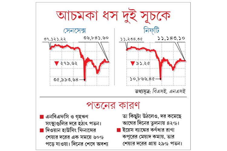 পরিকাঠামোয় ঋণদাতা সংস্থা আইএল অ্যান্ড এফএস আর্থিক সমস্যায় লগ্নিকারীদের ঋণপত্রের টাকা মেটাতে পারবে কি না, সেই আশঙ্কায় ক’দিন ধরেই ভুগছে বাজার। এ দিন জল্পনা ছড়ায় গৃহঋণ সংস্থা দিওয়ান হাউসিং ফিনান্সও একই সঙ্কটে। ফলে এক সময় তাদের শেয়ার দর ৬০% পড়ে যায়। যার জেরে নামতে থাকে বিভিন্ন গৃহঋণ সংস্থা এবং ব্যাঙ্ক নয় এমন আর্থিক প্রতিষ্ঠানগুলির (এনবিএফসি) শেয়ারের দাম। পরে দিওয়ান কর্তৃপক্ষ আর্থিক অবস্থা নিয়ে অভয় দিলে পরিস্থিতি শোধরায়। ইয়েস ব্যাঙ্কের দরের প্রায় ২৯% ধাক্কা খাওয়াও পতনে ইন্ধন জুগিয়েছে।