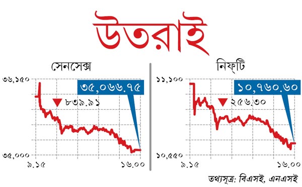 একা বাজেটে করের কোপে রক্ষে নেই। দোসর বিশ্ব বাজারের পতনও। সেই সঙ্গে আবার যোগ হয়েছে রাজকোষ ঘাটতি বাড়া নিয়ে রেটিং সংস্থাগুলির উদ্বেগ। আর এই তিনের চাপে শুক্রবার সেনসেক্সের পতন হল প্রায় ৮৪০ পয়েন্ট। নিফ্‌টি-ও নেমে গিয়েছে ২৫৬.৩০ অঙ্ক। আর এর ফলে বাজার থেকে মুছে গিয়েছে ৪.৬ লক্ষ কোটি টাকারও বেশি শেয়ার মূল্য।
