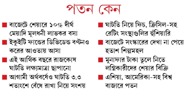 গত দু’বছরে এক দিনে এতটা পড়েনি বাজার। বিশেষজ্ঞদের দাবি, এর অন্যতম কারণ বাজেটের ধাক্কা। শেয়ারের উপর দীর্ঘ মেয়াদি মূলধনী লাভ কর বসানো। শেয়ার ভিত্তিক মিউচুয়াল ফান্ডের ডিভিডেন্ড বন্টনকে করের আওতায় আনা। এবং রাজকোষ ঘাটতির লক্ষ্যমাত্রা ছাড়ানো।
