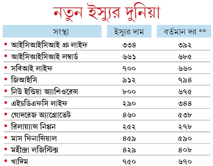 ২৯০ টাকায় ইস্যু করা এই শেয়ার নথিবদ্ধ হওয়ার পরে শুক্রবার বন্ধ হয়েছে প্রায় ৩৪৫ টাকায়। অর্থাৎ প্রথম দিনেই লাভ প্রায় ১৯%। এর আগে হতাশ করেছে এসবিআই লাইফ, জিআইসি ও নিউ ইন্ডিয়া-র ইস্যু। বছর খানেক আগে বাজারে আসা আইসিআইসিআই প্রু লাইফ প্রথমে না-পারলেও পরে লাভের সন্ধান দিয়েছে। খুব একটা লোকসানের মুখে ফেলেনি আইসিআইসিআই লম্বার্ড-ও। যে-সব সংস্থা সম্প্রতি বাজারে এসেছে, তাদের পুরো তথ্য দেওয়া হল সঙ্গের সারণিতে।