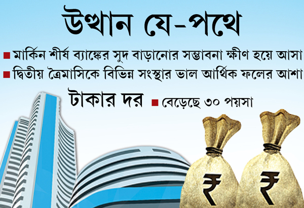 এ দিকে, দু’টি কারণ এ দিন শেয়ার বাজার চাঙ্গা হওয়ার পিছনে প্রধান ভূমিকা নিয়েছে বলে মত বিশেষজ্ঞদের। প্রথমত, আমেরিকার বর্তমান আর্থিক হালের পরিপ্রেক্ষিতে সেখানে সুদের হার এখনই বাড়ার সম্ভাবনা ক্ষীণ হয়ে যাওয়ার জেরে এশিয়া এবং ইউরোপের বাজার চাঙ্গা হয়ে ওঠে। দ্বিতীয়ত, চলতি আর্থিক বছরের দ্বিতীয় ত্রৈমাসিকে বিভিন্ন শিল্প সংস্থার ভাল ফল করার আশা এই উত্থানে ইন্ধন জুগিয়েছে। তবে শেয়ার সূচক দৌড়তে থাকলেও ভাঁজ পড়েছে বিশেষজ্ঞদের অনেকেরই কপালে। তাঁদের আশঙ্কা, বর্তমান অবস্থায় যে-কোনও সময়েই বাজারে বড় মাপের সংশোধন আসতে পারে।