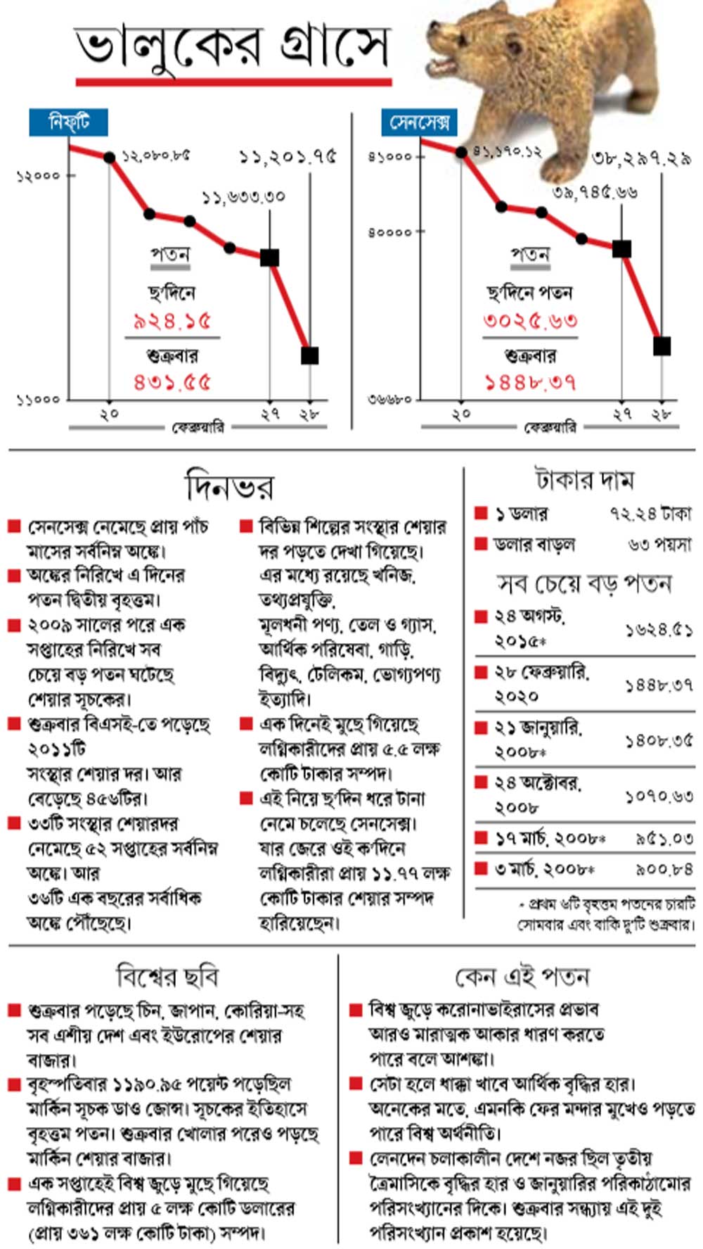 বৃদ্ধি নিয়ে হতাশা ঘিরে ধরার আগে অবশ্য শেয়ার বাজারের লগ্নিকারীরা করোনা-আতঙ্ক প্রত্যক্ষ করে ফেলেছেন। ধসের জেরে এ দিন সেনসেক্স আবার ফিরেছে ৩৮ হাজারের ঘরে। দাঁড়িয়েছে ৩৮,২৯৭.২৯ অঙ্কে। এই নিয়ে টানা ছ’দিনে সূচক পড়ল ৩০২৬ পয়েন্ট।