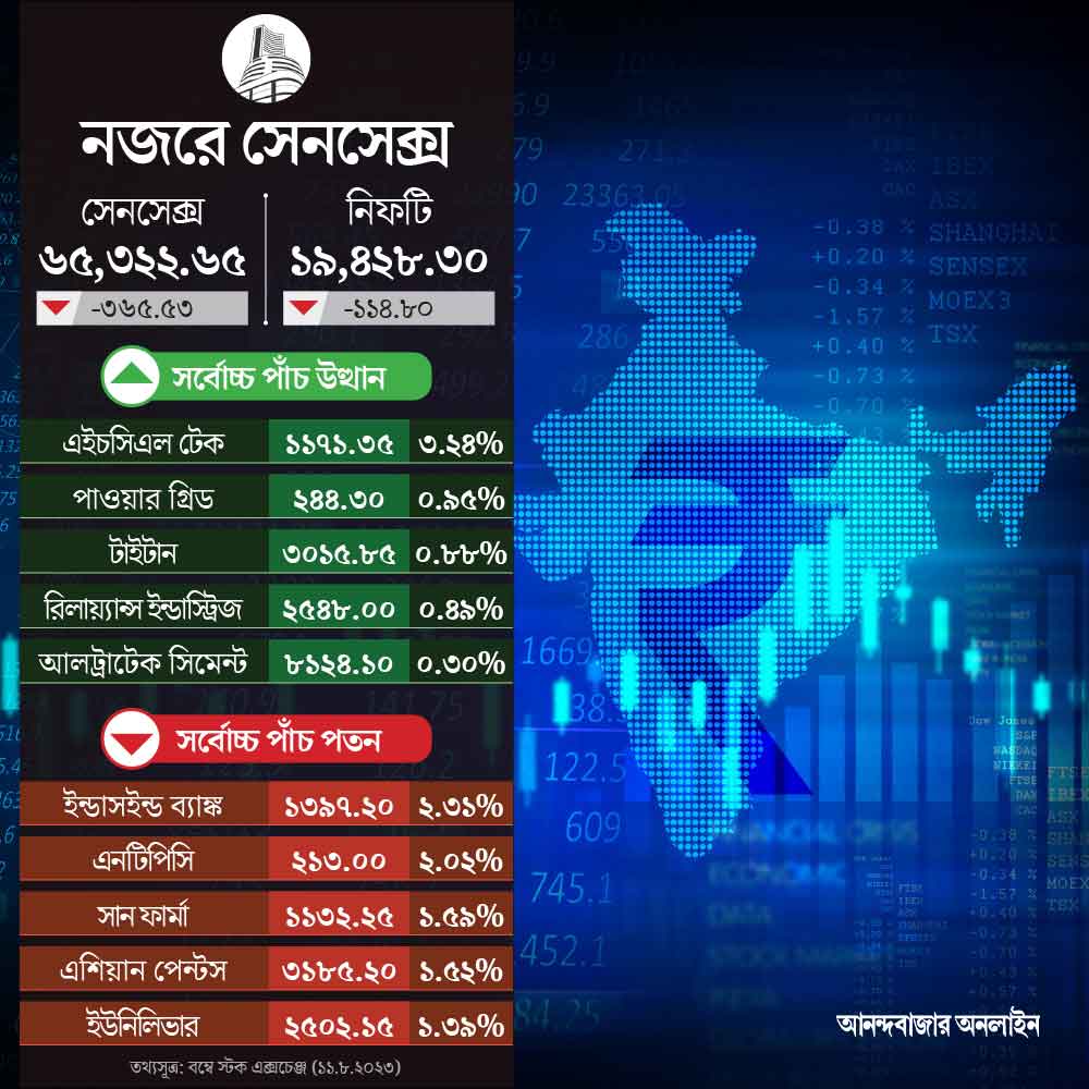 বৃহস্পতিবারের পর সপ্তাহের শেষ দিনেও পড়ল শেয়ার বাজারের সূচক। শুক্রবার সকাল থেকেই ক্ষতির মুখে পড়ে সেনসেক্স, নিফটি। সময় যত গড়িয়েছে, ক্ষতির পরিমাণ ততই বৃদ্ধি পেয়েছে। দিনের শেষে বৃহস্পতিবারের তুলনায় ৩৬৫.৫৩ পয়েন্ট নেমে সেনসেক্স শেষ করল ৬৫৩২২.৬৫ পয়েন্টে, ১১৪.৮০ পয়েন্ট কমে ১৯,৪২৮.৩০ পয়েন্টে থামল নিফটি।