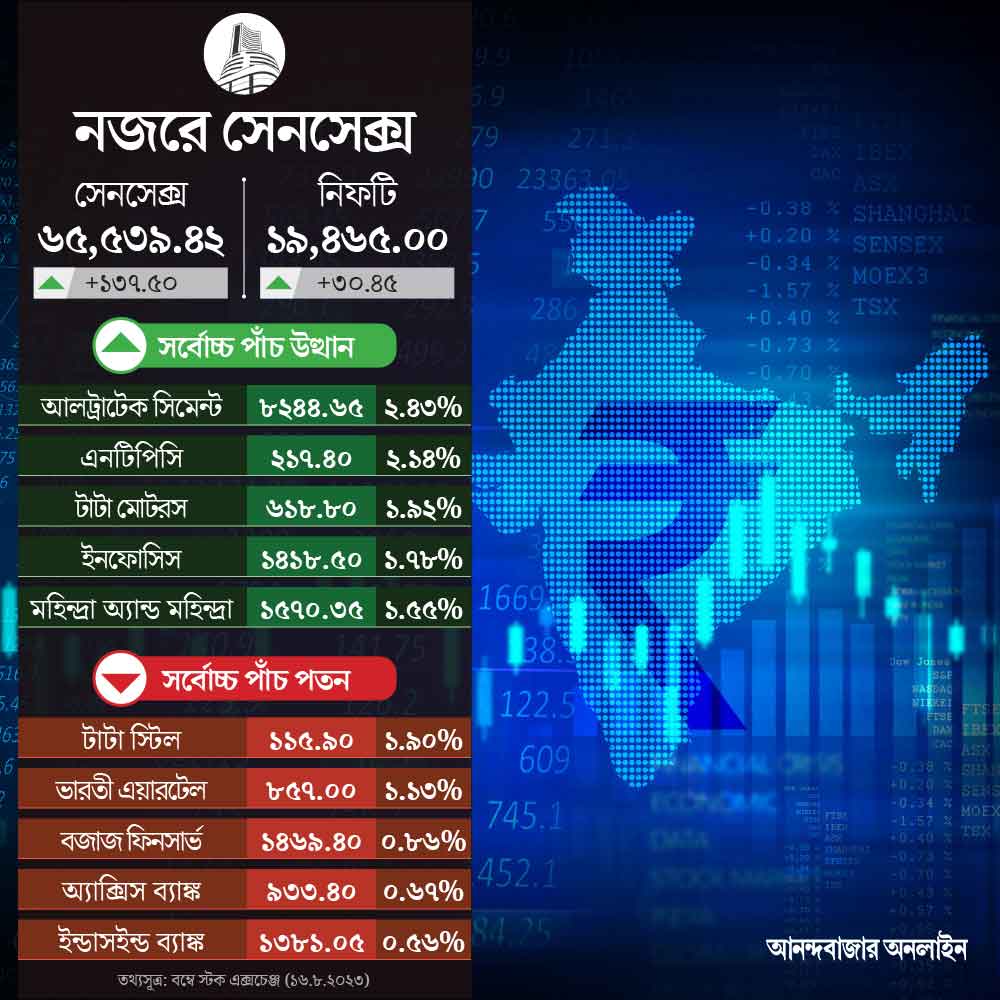 শেষ ভাল যার সব ভাল তার, বুধবার এই প্রবাদ আরও এক বার বাস্তবায়িত হল শেয়ার বাজারে। বিশ্ব বাজারে টানাপড়েন এবং মুদ্রাস্ফীতির কারণে এ দিন সকাল থেকেই বড় ক্ষতির মুখে পড়ে শেয়ার বাজার। দিনের সর্বনিম্ন সূচক ছিল ৬৫,০৩২.৮৯ পয়েন্ট, যা সোমবারের তুলনায় ৩৬৯ পয়েন্ট কম। বেলা গড়াতেই পরিস্থিতি বদলাতে শুরু করে, দিনের শেষে সপ্তাহের প্রথম দিনের থেকে ১৩৭.৫০ পয়েন্ট বৃদ্ধি পেয়ে ৬৫,৫৩৯.৪২ পয়েন্টে থামল সেনসেক্স। ৩০.৪৫ পয়েন্ট বৃদ্ধি পেয়ে ১৯,৪৬৫.০০ পয়েন্টে থামল নিফটি।