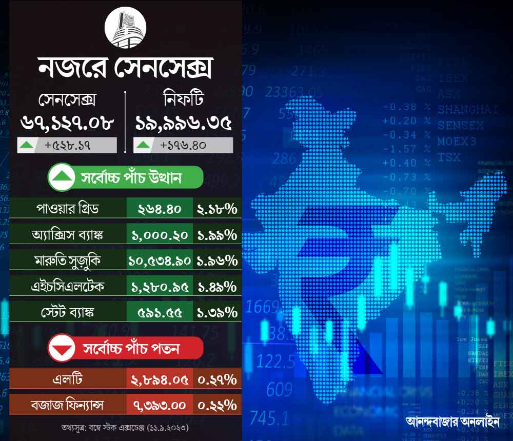 টানা সপ্তম দিন অপরাজেয় শেয়ার বাজার। সপ্তাহের প্রথম দিন ৫২৮.১৭ পয়েন্ট লাভ করে ৬৭,১২৭.০৮ পয়েন্টে শেষ করল সেনসেক্স। শুরুতে শুক্রবার যেখানে শেষ করেছিল তার থেকে বেশ কিছুটা এগিয়ে ছিল সূচক। সময় যত গড়িয়েছে তত বেড়েছে সেনসেক্স এবং নিফটি। এক লাফে ১৭৬.৪০ পয়েন্ট এগিয়ে ২০ হাজারের দোরগোড়ায় কড়া নাড়ছে নিফটি। দিনের শেষে নিফটি থামল ১৯৯৯৬.৩৫ পয়েন্টে।