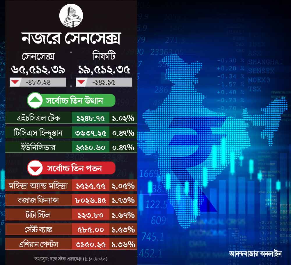 হামাস-ইজরায়েল সংঘাতের আবহে বড় ক্ষতির মুখে পড়ল শেয়ার বাজার। সোমবার শুরু থেকেই নিম্নমুখী ছিল সেনসেক্স এবং নিফটি। দিনের শেষে শুক্রবারের থেকে ৪৮৩.২৪ পয়েন্ট পড়ে ৬৫,৫১২.৩৯ পয়েন্টে শেষ করল সেনসেক্স। অন্য দিকে, ১৪১.১৫ পয়েন্ট নেমে ১৯,৫১২.৩৫ পয়েন্টে থামল নিফটি।