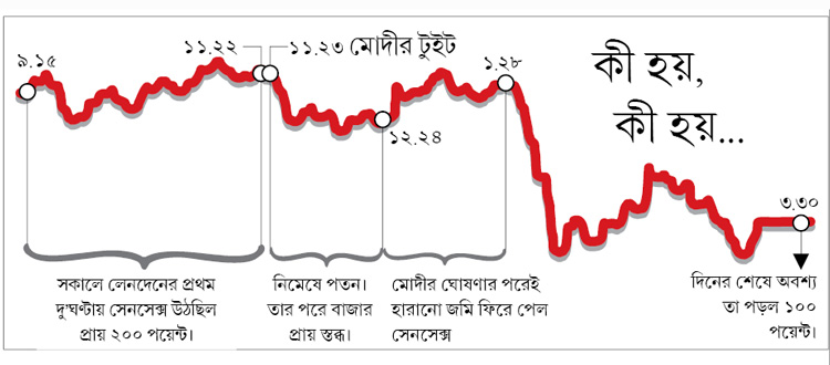সেনসেক্স মন্দার আশঙ্কা ভুলে বুধবারও সকাল থেকে উঠছিল, ১১টা ২৩ মিনিটে মোদীর বার্তা দেওয়ার টুইটের পরেই তা পড়ল ১০০ পয়েন্ট। তার পর থেকে যত ক্ষণ না তিনি পর্দায় হাজির হলেন, সেই এক ঘণ্টা বাজারও প্রায় এক জায়গাতেই দাঁড়িয়ে রইল। কখনও তা এগোল কয়েক পয়েন্ট। আবার কখনও কমল সামান্য। কিন্তু সকালের গতি ফিরল না।