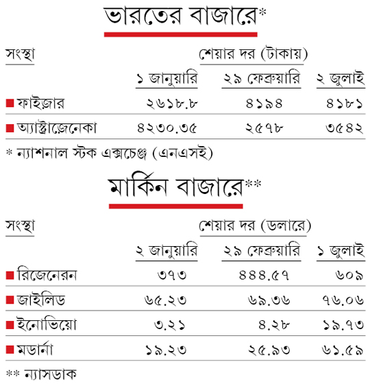 একই ঘটনার সাক্ষী মার্কিন শেয়ার বাজারও। রিজেনেরনের বাতের চিকিৎসার ওষুধ করোনা উপশমে কাজে লাগতে পারার ঘোষণার দৌলতে তাদের শেয়ার আগুন। প্রতিষেধকের দৌড়ে প্রাথমিক সাফল্যের সুখবর ছ’মাসের মধ্যে ৩.২১ ডলার থেকে ১৯.৭৩ ডলারে পৌঁছে দিয়েছে ইনোভিয়োর মতো ছোট সংস্থার শেয়ারকেও। মানে, বৃদ্ধি ৫১৪%! করোনা নিরাময়ের গবেষণার দৌড়ে এগিয়ে যাওয়া কিংবা পিছিয়ে পড়ার আঁচ পোহাতে হচ্ছে জাইলিড, মডার্না, নোভাভ্যাক্স, জনসন অ্যান্ড জনসন, গ্ল্যাক্সোস্মিথক্লাইনের মতো বিভিন্ন সংস্থাকে।