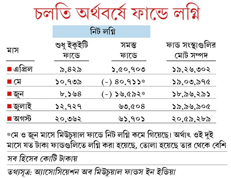 অগস্টে মিউচুয়াল ফান্ড শিল্পে মোট সম্পদের পরিমাণ পৌঁছে গিয়েছে ২০.৬ লক্ষ কোটি টাকায়। এটিও একটি নজির। গত মাসে বিদেশি লগ্নিকারীরা ১০,০০০ কোটি টাকার শেয়ার বেচলেও বাজার তেমন নামেনি ফান্ডগুলি ১৬,০০০ কোটি টাকার শেয়ার কেনায়। বিভিন্ন ফান্ডে এখন এসআইপি অ্যাকাউন্টের সংখ্যা কম-বেশি ১.৫ কোটি। এই পথে প্রতি মাসে ফান্ডে লগ্নি হচ্ছে ৫,০০০ কোটি। এই সমস্ত হিসেব ভারতীয় বাজারের পক্ষে খুবই সদর্থক। আশা করা যায়, শেয়ারে এ রকম লগ্নি চলতে থাকলে বাজার কখনওই তাসের ঘরের মতো হুড়মুড়িয়ে ভেঙে পড়বে না।