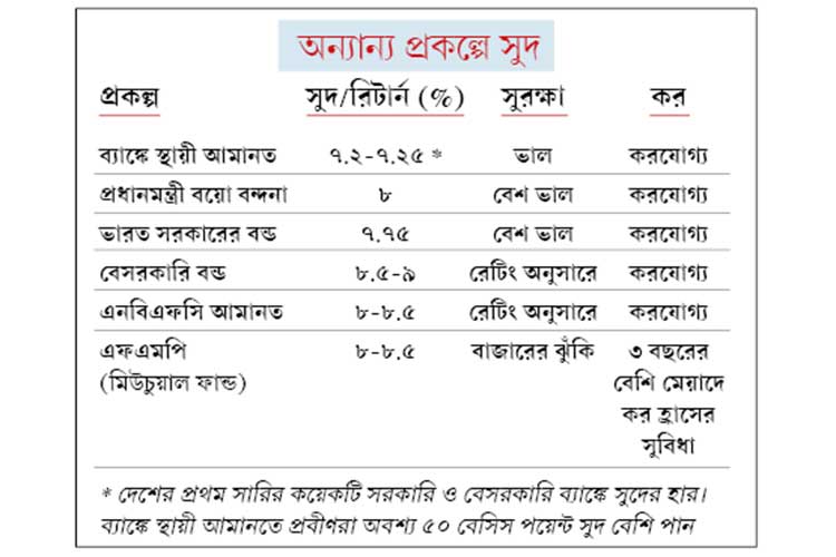 অনেক প্রকল্পে প্রবীণরা সুদ পান ২৫-৫০ বেসিস পয়েন্ট বেশি। এই বাড়তি সুদ ধরলে কোনও কোনও ক্ষেত্রে তাঁদের প্রাপ্তি দাঁড়িয়েছে ৮.৫ শতাংশ। তাই সব মিলিয়ে প্রবীণদের জন্য পরিস্থিতি আগের থেকে ভাল।