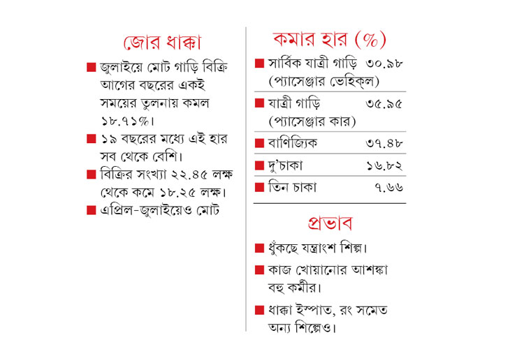 গাড়ি বিক্রি যে ক্রমাগত কমছে এবং সংস্থাগুলি যে বড় সমস্যার সামনে দাঁড়িয়ে, তা নতুন কিছু নয়। কিন্তু মঙ্গলবার গাড়ি সংস্থাগুলির সংগঠন সিয়াম জুলাইয়ের যে বিক্রির পরিসংখ্যান প্রকাশ করেছে, তা ঠান্ডা স্রোত বইয়ে দিয়েছে অর্থনীতির শিরদাঁড়ায়। কারণ, গত মাসে দেশের মধ্যে গাড়ির পাইকারি বিক্রি কমার হার দাঁড়িয়েছে প্রায় দু’দশকের মধ্যে সব চেয়ে বেশি। এর পরে শোরুম থেকে খুচরো বিক্রির তথ্য প্রকাশিত হলে ছবিটা আরও স্পষ্ট হবে।