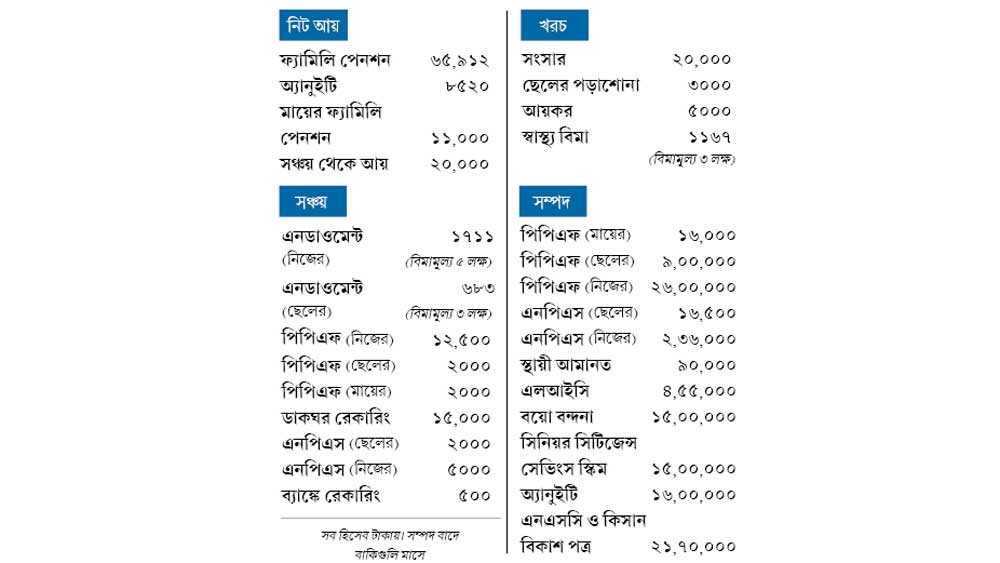 • এখন বয়ো বন্দনা যোজনা, কিসান বিকাশপত্র থেকে মাসে যে ২০,০০০ টাকা আয় হয়, তা সিমেস্টারে ছেলের টিউশন ফির জন্য রেখে দেন সমীরণ। ছেলের উচ্চশিক্ষা শেষ হলে সেই টাকা আর লাগবে না। তা থেকে নিজের মাসিক খরচের ব্যবস্থা করতে পারবেন সমীরণ।