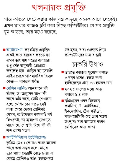 বিশ্ব ব্যাঙ্কের রিপোর্ট অনুযায়ী, ২০২১-এর মধ্যে শুধু যন্ত্রের কারণে ৬৯% চাকরি কমবে ভারতে। আন্তর্জাতিক সমীক্ষা সংস্থা হর্সেস ফর সোর্সেস রিসার্চের দাবি, চার বছরে ৬.৪ লক্ষ কাজের সুযোগ হারাবে। বিশেষত মার খাবে তথ্যপ্রযুক্তি পরিষেবা ও বিপিও। যেখানে অনেক ক্ষেত্রে একই কাজ করতে হয় বারবার। কিছু কাজে দক্ষতাও লাগে কম। সংশ্লিষ্ট মহলের মতে, টেক মহীন্দ্রার এই সিদ্ধান্তের কারণও মূলত এটি।