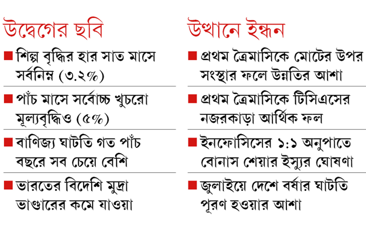 • ব্যাঙ্কিং শিল্প নিয়ে দুশ্চিন্তা বহাল ঠিকই। কিন্তু প্রথম তিন মাসে বেসরকারি ইন্ডাসইন্ড ব্যাঙ্কের নিট মুনাফা বেড়েছে ২৪%। অন্যান্য বেসরকারি ব্যাঙ্কও ভাল ফল করবে বলে আশা। কিছুটা উন্নতি হতে পারে রাষ্ট্রায়ত্ত ব্যাঙ্কের ফলে।