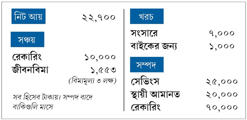• অভিজিতের প্রভিডেন্ট ফান্ড নেই। তাই এর পরে বেতন বাড়লে প্রথম কাজ হবে নিজের নামে একটি পিপিএফ অ্যাকাউন্ট খুলে সেখানে নিয়মিত টাকা জমানোর ব্যবস্থা করা। অবসর জীবনের খরচ সামলাতে তা-ও কাজে লাগবে।