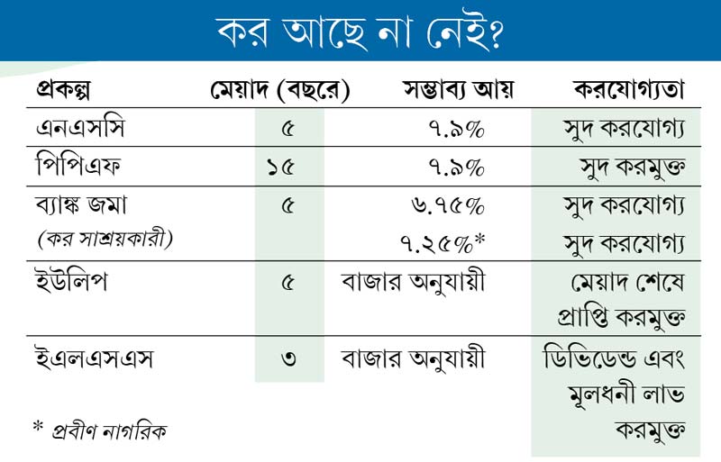 •থোক টাকা লগ্নি করতে হলে, আগে দেখতে হবে কোন কোন প্রকল্পে করছাড় আছে। কোনও প্রকল্পে সুদ বা আয় একটু কম হলেও হয়তো দেখা যাবে সেই আয় করমুক্ত হওয়ার কারণে বেশ আকর্ষণীয়। যে-প্রকল্পে সুদ তুলনায় বেশি, আখেরে হয়তো তার থেকেও আরও খানিকটা বেশি নিট রিটার্ন মিলছে তাতে।