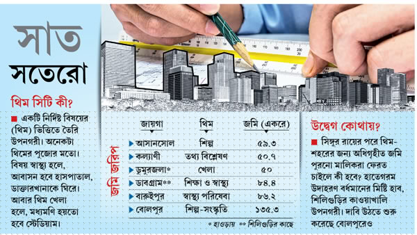 থিম সিটি প্রকল্পের জন্য অধিকাংশ জমি অধিগৃহীত। যেমন, বারুইপুরে ১০০% জমিই তা-ই। সে ক্ষেত্রে মালিক তা ফেরত চাইতে পারেন। হাতেগরম উদাহরণ কাওয়াখালি উপনগরী প্রকল্প। ২০০৪ সালে উপনগরী তৈরির জন্য জমি অধিগ্রহণ করা হয়েছিল। অনিচ্ছুকরা জমি ফেরত চেয়ে আন্দোলন করেন। আইনি জটিলতায় তা ফেরানো যায়নি। কিন্তু এখন সিঙ্গুর মামলার রায়কে সামনে রেখে সাড়ে ১১ একর জমি ফিরিয়ে দেওয়ার কথা জানিয়েছে শিলিগুড়ি-জলপাইগুড়ি ডেভেলপমেন্ট অথরিটি। বর্ধমানেও মিষ্টি হাব তৈরির জন্য চিহ্নিত জমি ফেরাচ্ছে রাজ্য। খোদ মুখ্যমন্ত্রীই সে কথা জানিয়েছেন। ফের নতুন করে হাবের জন্য জমি চিহ্নিত করেছে রাজ্য। এই পরিস্থিতিতে ‘থিম সিটি’ প্রকল্পের জমি নিয়ে কতটা নিশ্চিন্ত থাকা যেতে পারে, সেই প্রশ্ন ঘুরপাক খাচ্ছে নির্মাণ শিল্পমহলে।