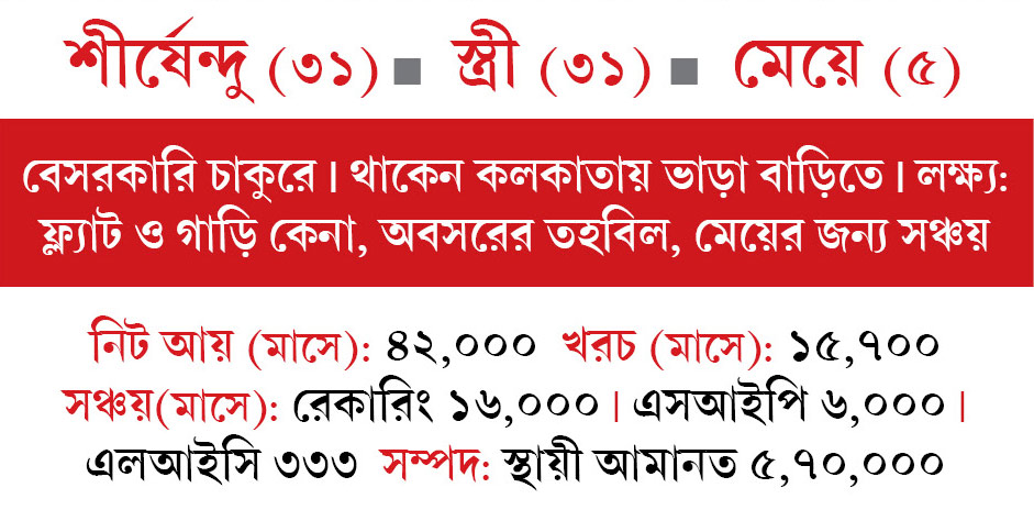আর পাঁচ জনের মতোই চোখে কিছু স্বপ্ন রয়েছে শীর্ষেন্দুর। তাঁর প্রোফাইলের সবচেয়ে ভাল গুণ হল ব্যয়কে নির্দিষ্ট অঙ্কে বেঁধে রাখা। আর সুযোগ মতো সঞ্চয়ের ঝুলি ভর্তি করা। আর তাঁর শঙ্কার জায়গা হল, পরিবারের একমাত্র রোজগেরে হয়েও নিজের উপযুক্ত জীবন ও স্বাস্থ্যবিমার ব্যবস্থা না-করা। পাশাপাশি, তাঁর বেশিরভাগ লগ্নিই রয়েছে ঋণপত্র নির্ভর প্রকল্পে, যেখানে সুদ তুলনায় কম ও কর দিতে হয়।