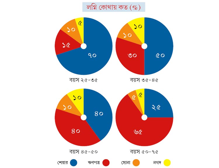 * লগ্নির ক্ষেত্রে কেউ সাবধানী, কেউ ঝুঁকি নিতে পছন্দ করেন। এখানে আমরা সাধারণত বয়স অনুসারে কোথায় কত লগ্নি করা উচিত, তার একটা হিসেব দেওয়ার চেষ্টা করেছি। যা দেখে বোঝা যাবে, মোটামুটি কী ভাবে তহবিল ছড়ালে ভাল হয়। বাকিটা অবশ্যই নির্ভর করবে আপনার আর্থিক অবস্থা, মানসিকতা, সংসারের দায়দায়িত্ব ও বয়সের উপরে।