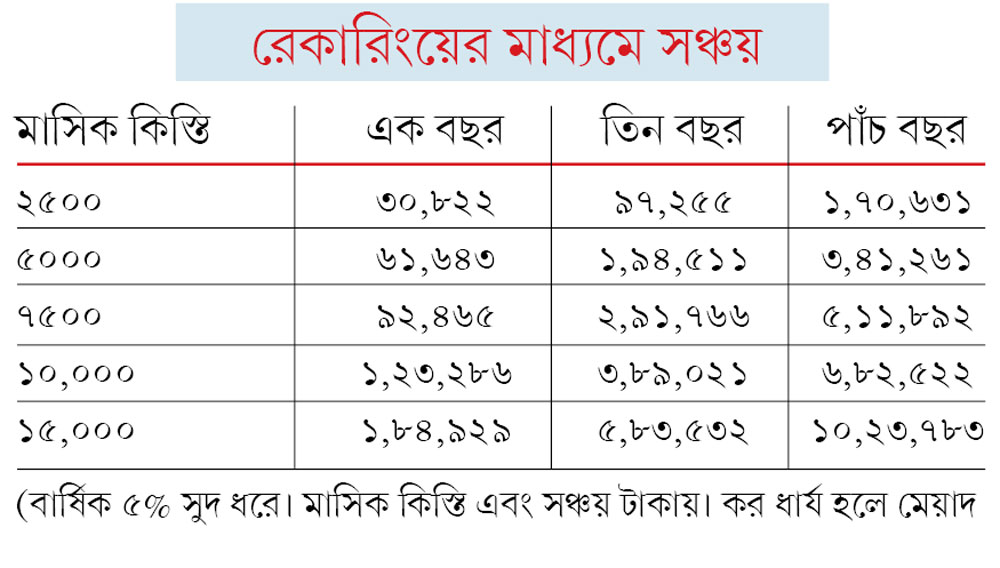এতে সুবিধা কী? সুদ কিছুটা বেশি পাওয়ার পাশাপাশি রয়েছে পুঁজির নিরাপত্তা, নিশ্চিত রিটার্ন। হঠাৎ কোনও দরকার পড়লে প্রকল্প থেকে টাকা ভাঙানোর সুযোগও রয়েছে। পারস্পরিক দূরত্ব বজায় রেখে ব্যাঙ্কের শাখায় না-গিয়েও এখন এই প্রকল্পগুলিতে লগ্নি শুরু করা যায় নেটব্যাঙ্কিং অ্যাকাউন্ট বা সংশ্লিষ্ট ব্যাঙ্কের মোবাইল অ্যাপ্লিকেশনের মাধ্যমে। নির্দিষ্ট মেয়াদের জন্য রেকারিং অ্যাকাউন্ট খুললে কী রকম তহবিল তৈরি হতে পারে তার একটা উদাহরণ সারণিতে দেওয়া হল।