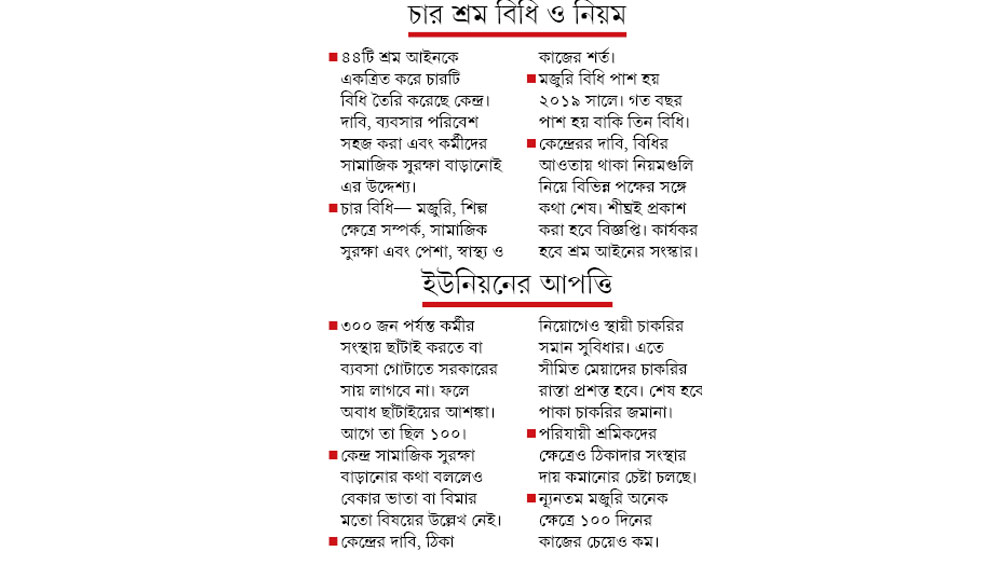 শ্রম ক্ষেত্রের ৪৪টি আইনকে একত্রিত করে চারটি বিধি তৈরি করেছে কেন্দ্র। মোদী সরকারের দাবি, তারা সমস্ত পক্ষের সঙ্গে আলোচনার প্রক্রিয়া শেষ করেছে। এ বার বিজ্ঞপ্তি জারির পালা। শ্রম যেহেতু যৌথ তালিকাভুক্ত, কয়েকটি নিয়ম তৈরি করতে হবে রাজ্যগুলিকেও।