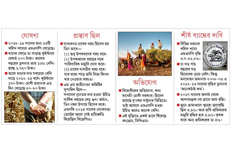 গত লোকসভা ভোটের আগে অর্থনীতি ঘুরে দাঁড় করানোর স্বপ্ন দেখিয়েছিলেন প্রধানমন্ত্রী পদপ্রার্থী নরেন্দ্র মোদী। তা না হওয়ার কারণ হিসেবে দুষেছিলেন ইউপিএ জমানার নীতিপঙ্গুত্বকে। জোর দেন বৃদ্ধি ৮-১০ শতাংশে নিয়ে যাওয়ায়। প্রতিশ্রুতি দেন কৃষকদের আয় দ্বিগুণ করারও। সে জন্য এমএসপি-কে হাতিয়ার করার কথাও ঘোষণা করেছিলেন।