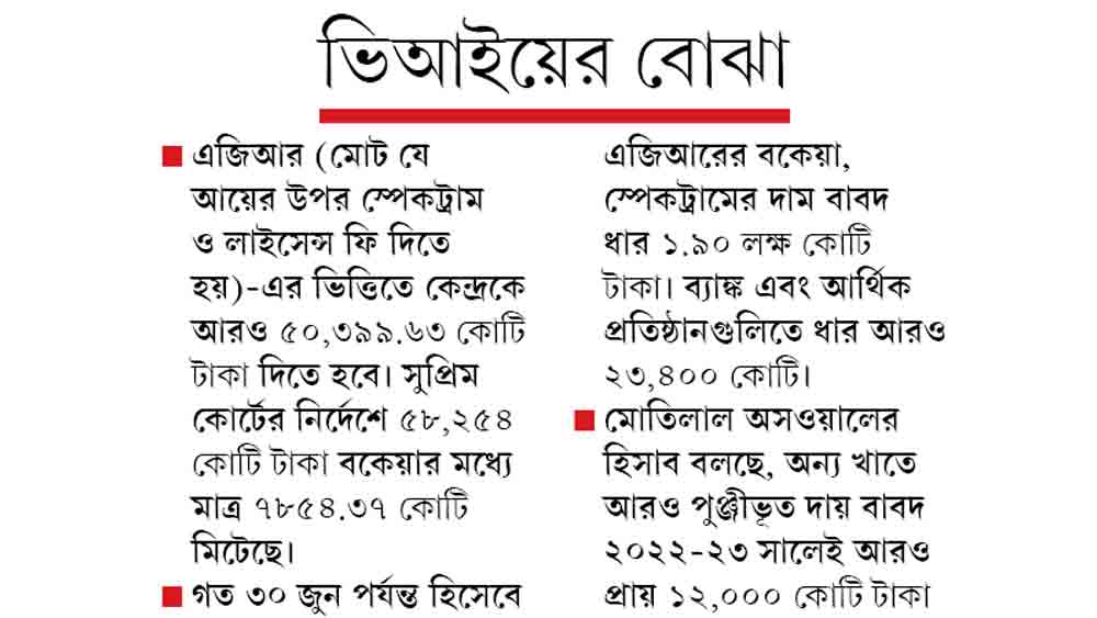 মূল্যায়ন সংস্থা ব্রিকওয়ার্ক রেটিংস জানাচ্ছে, ভিআই-র আগামী ৩১ মার্চের মধ্যে এজিআর (মোট যে আয়ের উপর স্পেকট্রাম ও লাইসেন্স ফি দিতে হয়)-এর বকেয়া কিস্তি বাবদ ৮০০০-৯০০০ কোটি টাকা এবং স্পেকট্রামের দাম খাতে ১৫,০০০ কোটি দেওয়ার কথা ছিল কেন্দ্রকে। তা স্থগিত হলেও পরে সেই দায় মেটানোর বন্দোবস্ত করতে হবে এখন থেকেই। তবে উপদেষ্টা সংস্থা মোতিলাল অসওয়ালের হিসাব, অন্য খাতে পুঞ্জীভূত নানা দায় বাবদ ২০২২-২৩ সালেই আরও ১২,০০০ কোটি টাকা শোধ করতে হবে। শুধু কেন্দ্রের পদক্ষেপে সমস্যা মিটবে না দাবি করে ক্রেডিট সুইস-এরও বক্তব্য, অন্যান্য ধার শোধে ভিআই-এর ৬ থেকে ৯ মাসে ১০০ কোটি ডলার (প্রায় ৭৪০০ কোটি টাকা) লাগবে।