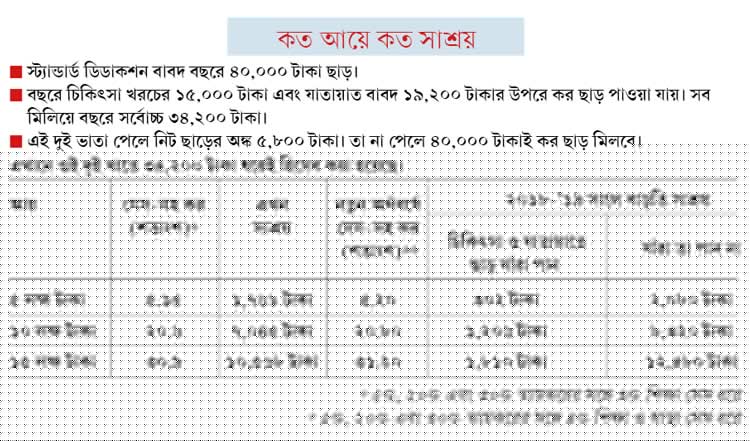 • তবে যাঁরা তা পান না, তাঁরা ওই ৪০,০০০ টাকাই কর ছাড় পাবেন। বিস্তারিত জানতে তালিকা দেখুন।